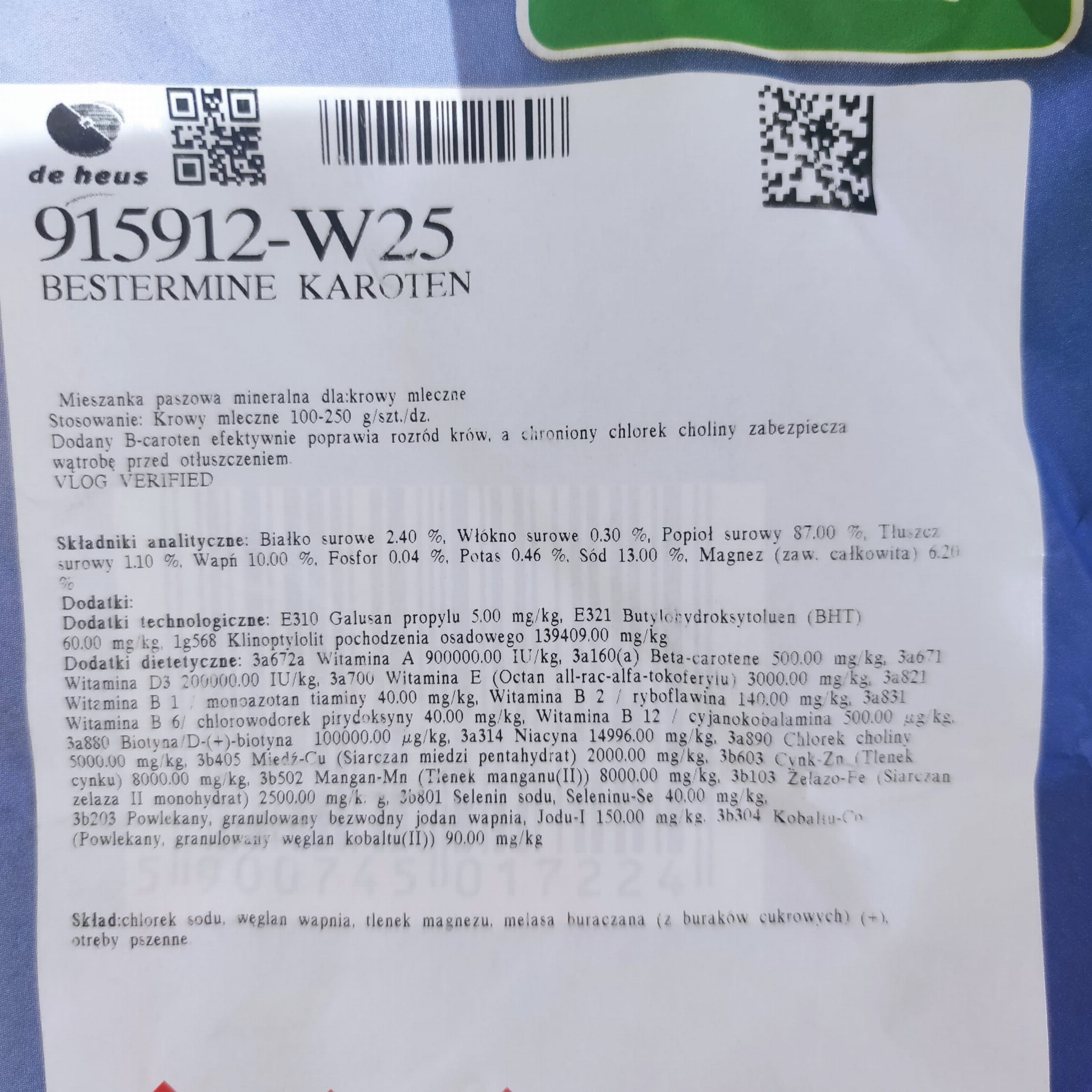 Bestermine Karoten Mieszanka mineralno - witaminowa dla bydła mlecznego wysokowydajnego 25kg De Heus: Wysoka wydajność mleczna osłabia parametry rozrodu krów. Dla takich krów zalecamy mieszankę mineralno - witaminową z beta - karotenem. Ten dodatek paszowy, jako prekursor witaminy A poprawia gospodarkę hormonalną, a chroniona cholina zabezpiecza wątrobę przed otłuszczeniem. Wysoki udział biotyny i niacyny to dodatkowe atuty produktu.